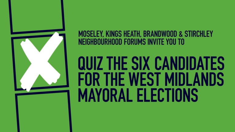 Moseley Forum, together with Kings Heath Residents Forum, Stirchley Neighbourhood Forum and Brandwood Forum are very pleased to invite you to take part in our hustings event on Tuesday 25th April 2017 for the inaugural West Midlands Mayoral Election (the election is to be held on 4th May 2017).