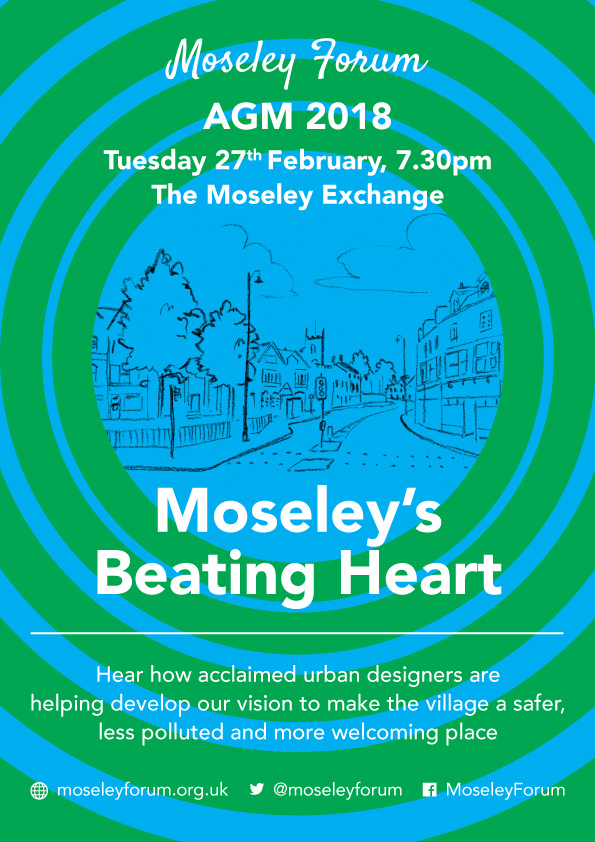 In January, Moseley Forum was awarded £10,000 following a bid for Local Innovation Funding from Birmingham City Council. Working with renowned urban design and transportation experts, Phil Jones Associates, Moseley Forum will be developing a vision to make the village a safer, less polluted and more welcoming place. Our AGM will be an opportunity to hear more about the vision and how the community will be consulted.