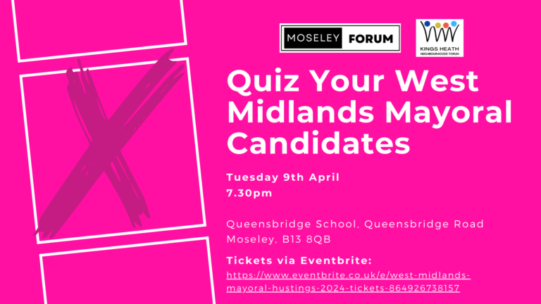 Thats why Moseley Forum and Kings Heath Residents Forum have jointly put together a Hustings event for you.