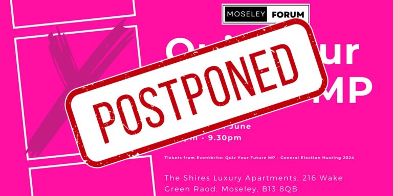 Everyone at Moseley Forum are truly sorry that we are having to take this action – but we know how busy / snap this election has been for everyone. However, we will work to re hold the event the following week. If this cannot be achieve then whoever is elected on July 5th – we will work to have them at our final meeting before we break for the summer.