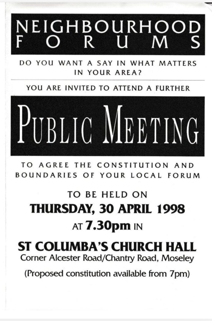 The first ever Moseley Forum meeting held in April 1998 at St. Columba’s Church Hall.